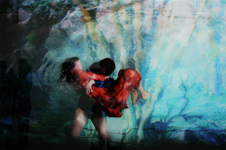 Det nederste er tatt i et basseng, med modeller som ligger oppi. Bakgrunnen er et stort bilde som er lagt på bunnen av bassenget.